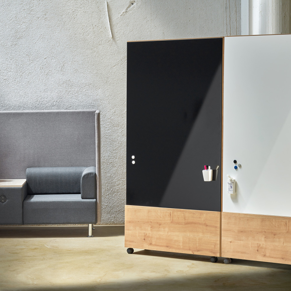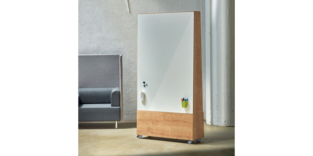Sa structure en mélaminé épaisseur 19 mm apporte une esthétique chaleureuse et contemporaine, tout en garantissant une excellente stabilité. Grâce à son système de fixation magnétique, les tableaux d’écriture sont solidement maintenus tout en restant faciles à installer ou à remplacer. Le tableau d’écriture est monté sur roulettes en polymère technique, permettant un déplacement fluide et sécurisé.