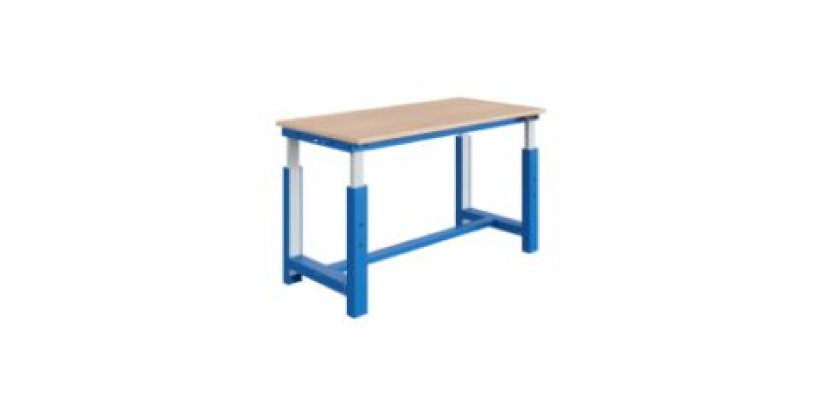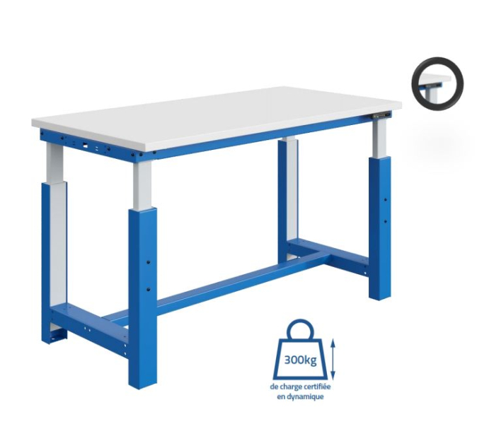 Les montants avant sont réglables en hauteur au pas de 50 mm dans une plage de 750 à 950 mm mesurée sous le plateau. L’utilisateur peut ainsi régler celui-ci en fonction de sa morphologie et/ou des opérations à réaliser.
