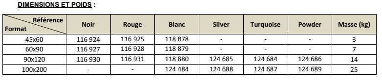 Coloris disponibles selon format :