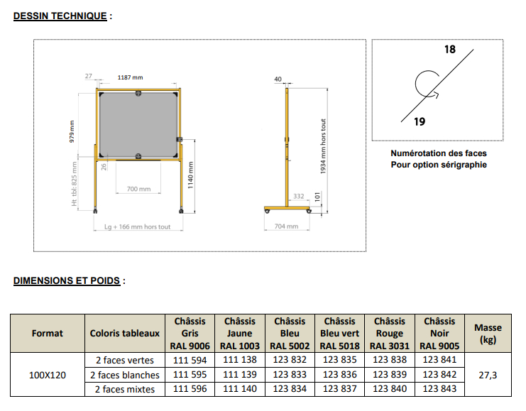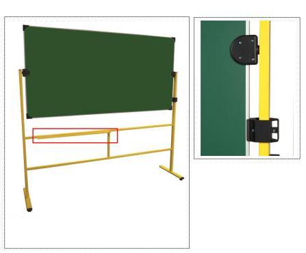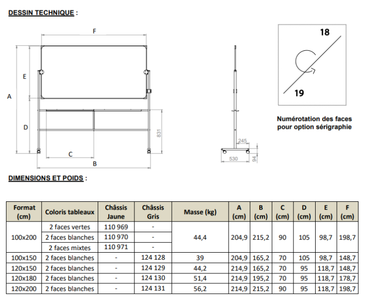 Ce modèle permet une rotation au choix horizontale ou verticale, définie lors du montage. Il est monté sur un châssis mobile équipé de roulettes avec frein ou de patins fixes, offrant une grande flexibilité d’utilisation en salle de classe ou en espace polyvalent.
