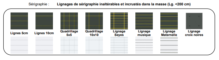 Les deux faces d’écriture peuvent être blanches, vertes ou mixtes, avec possibilité d’ajout de sérigraphies pédagogiques (lignages, quadrillages, portées musicales, etc.).