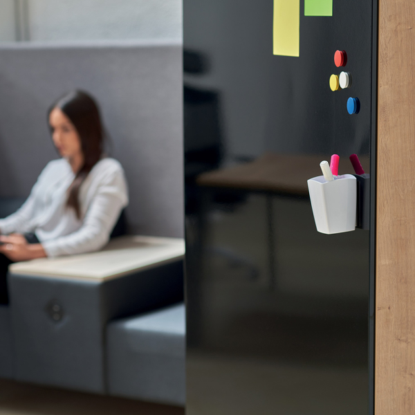 Sa structure en mélaminé épaisseur 19 mm apporte une esthétique chaleureuse et contemporaine, tout en garantissant une excellente stabilité. Grâce à son système de fixation magnétique, les tableaux d’écriture sont solidement maintenus tout en restant faciles à installer ou à remplacer. Le tableau d’écriture est monté sur roulettes en polymère technique, permettant un déplacement fluide et sécurisé.